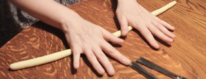 Coupez ensuite la boule de pâte en 4, farinez le plan de travail et roulez chaque part à la main, l’idée est de faire une sorte de boudin avec la pâte comme çà :