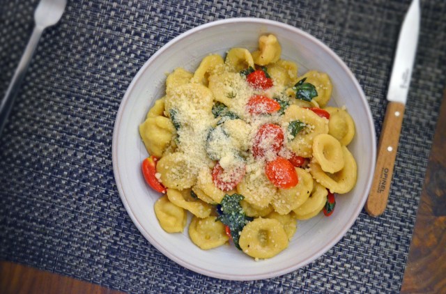 Now you just need to cook your pasta in salted water, be careful the cooking time is very short, less than 1 minute after water is boiling again. I served the orecchiette with cherry tomatoes, basil, mozzarella, a touch of olive oil and a bit of parmesan.