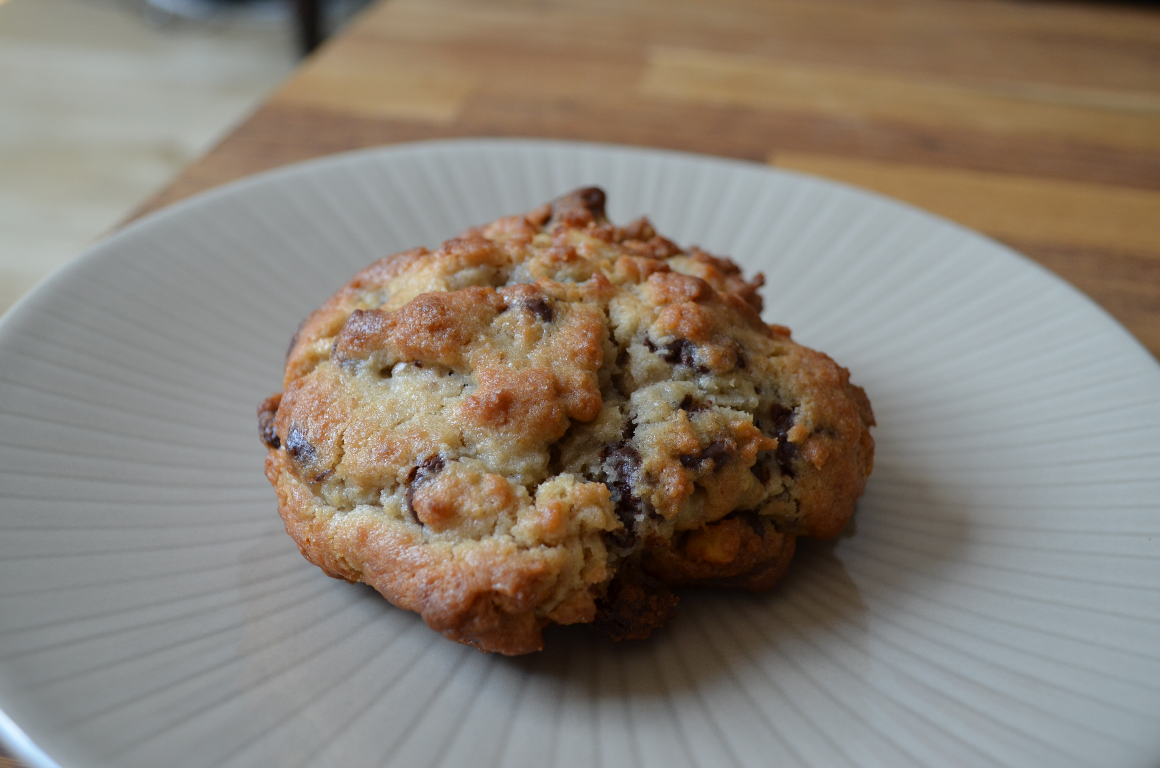 Oui c’est vrai, comme je l’avais lu, les cookies sont énormes. Pas en diamètre mais ils sont très épais et pèsent lourds. Lorsqu’on m’a remis le sachet contenant mon chocolate chip & walnut cookie, j’ai été surprise du poids du sachet ! En effet j’ai pesé mon cookie en rentrant : 180 g ! Pour vous donner un point de comparaison, c’est environ le poids d’un paquet de 12 cookies acheté en supermarché. Mais oublions ce détail hein parce que le cookie était délicieux, incroyablement frais, croquant à l’extérieur et si moelleux à l’intérieur, des chocolate chips d’une taille généreuse légérement fondus qui se mariaient à merveille avec le croquant de la noix de pécan, du sucre et du beurre oui mais sans tomber dans l’excès…bref un vrai bonheur en bouche. Allez, sur ce il faut que j’y aille, j’ai environ 200 g à perdre.