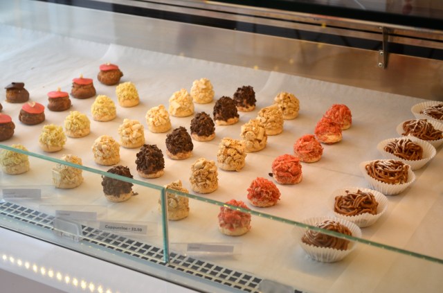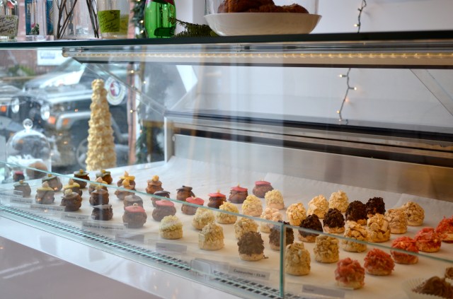 Ce que j’aime chez Caprices, c’est que Sophie apporte ses créations uniques et fait découvrir à Brooklyn des pâtisseries françaises peu connues et plutôt introuvables à New York. A Paris, la pâte à choux a le vent en poupe depuis 2 ans avec les choux de Popelini ou les éclairs de L’Eclair de Génie; et j’étais surprise que personne n’ait exporté l’idée du chou ici mais grâce à Sophie, c’est chose faite. Ce matin en boutique de beaux choux craquelins au chocolat, caramel au beurre salé, lemon curd, pistache orange, eau de rose et framboise. Le craquelin est une pâte constituée d’un mélange de cassonade, beurre et farine, que l’on étale très finement, et que l’on dispose sur les choux. Le craquelin donne un côté croustillant au chou et lui permet de bien gonfler à la cuisson sans craquer.