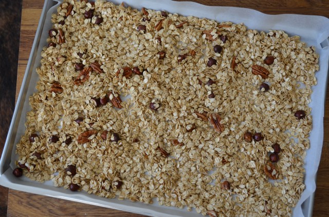 Sortez la plaque du four et remuez le tout avec une cuillère. Enfournez de nouveau pour 20 min jusqu’à ce que le granola colore.