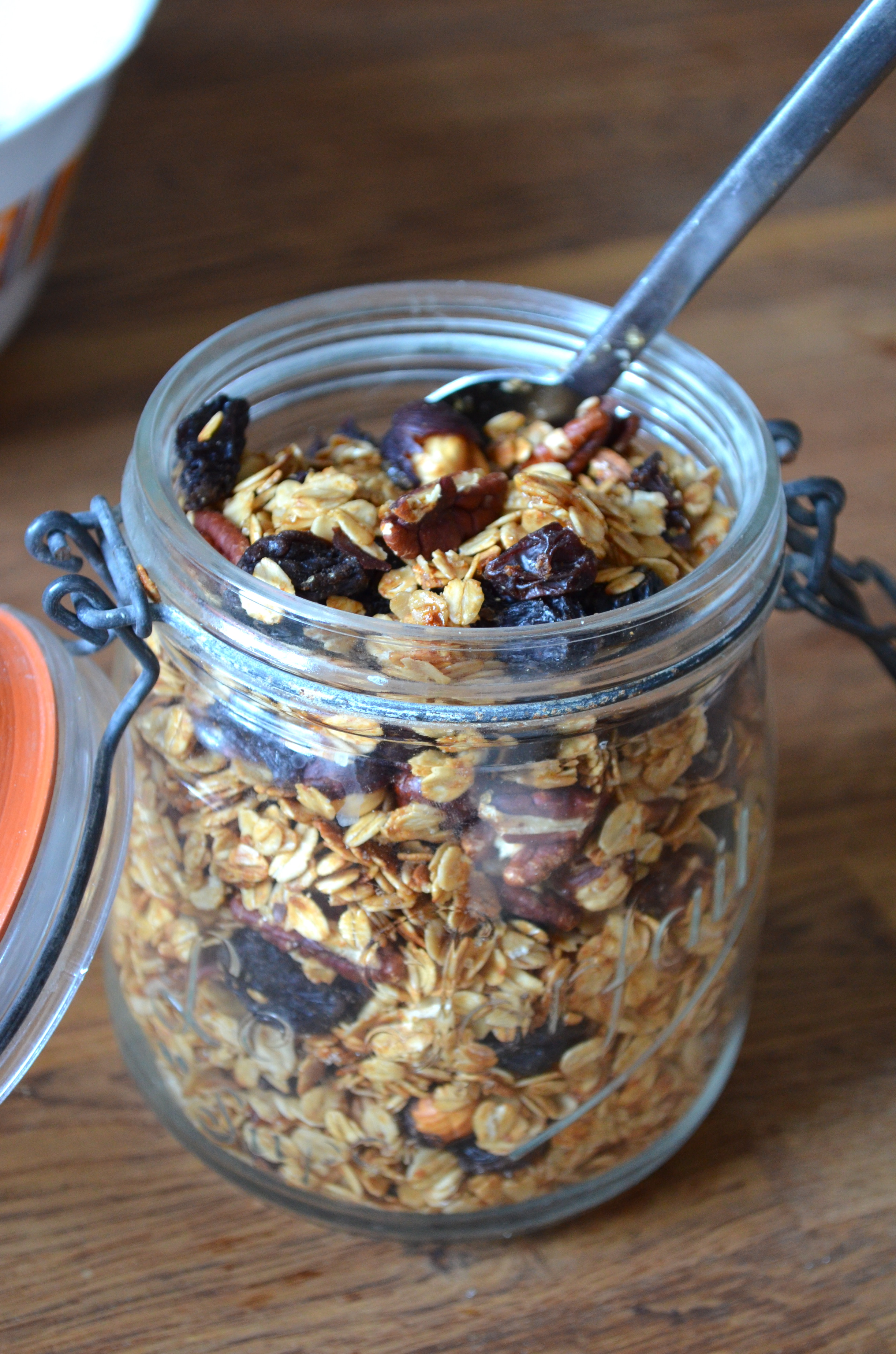 Le Granola, un grand classique ici aux US, à la carte de la plupart des petits déjeuners ou brunchs; servi avec du yaourt ou du lait. Une recette extrêmement simple qui vous permet de maîtriser la quantité de sucre (souvent un peu trop importante dans les granolas vendus dans le commerce) et de varier les associations noix et fruits secs en fonction de vos envies.