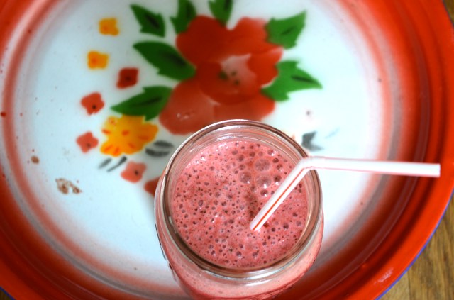 Put all the ingredients in the bowl of the blender and mix everything. You can add some ice if you wish for a colder smoothie.