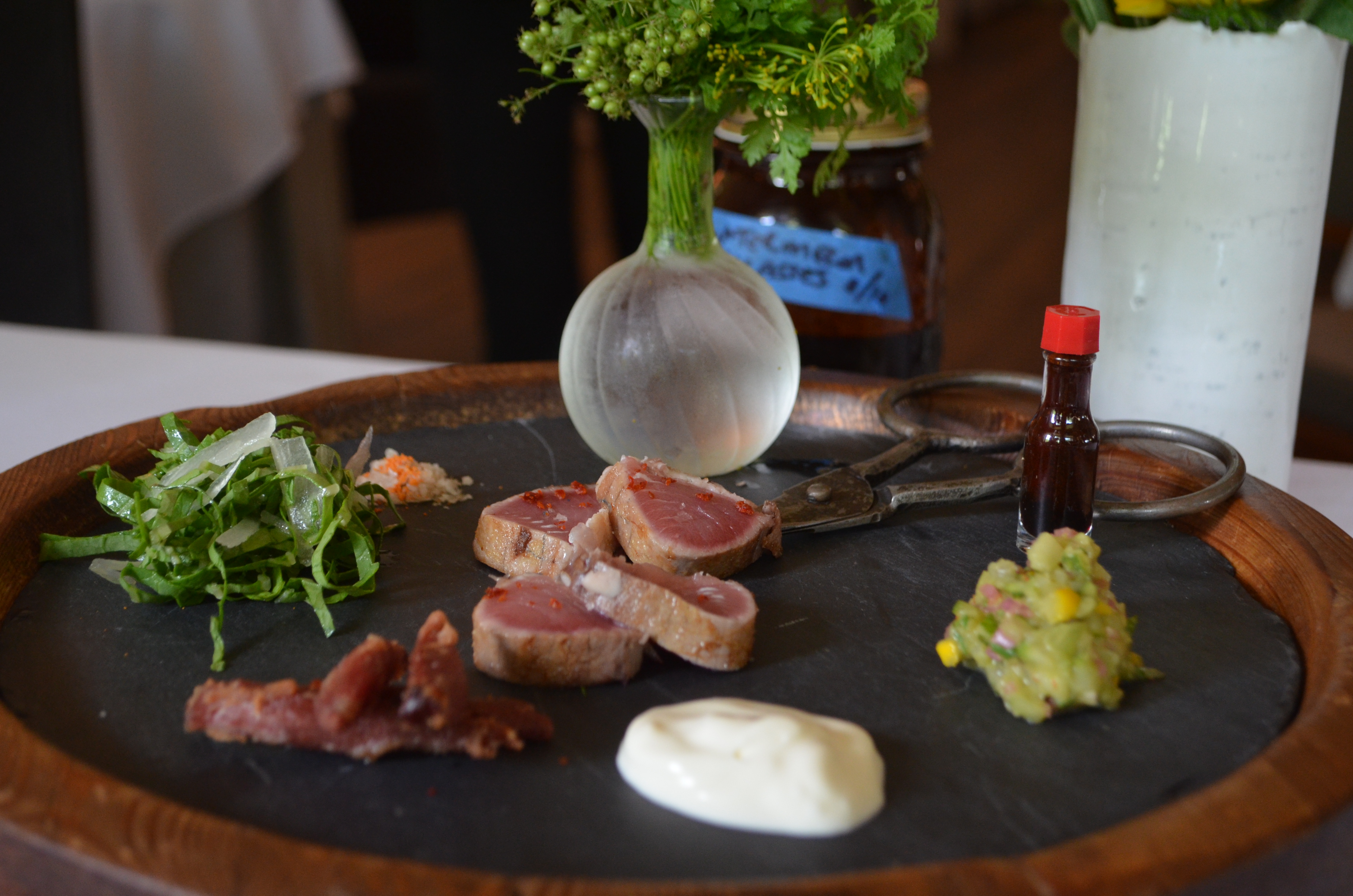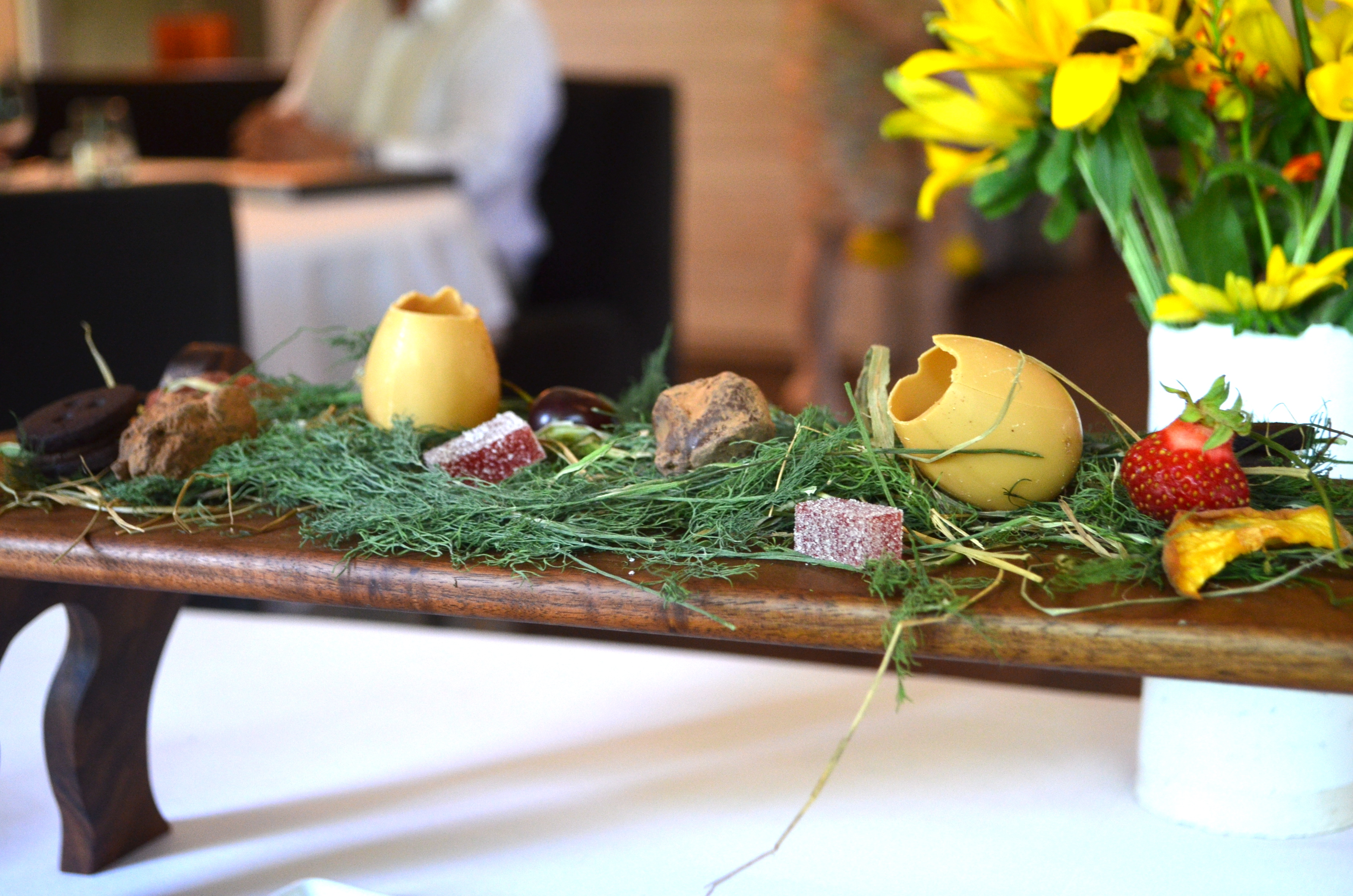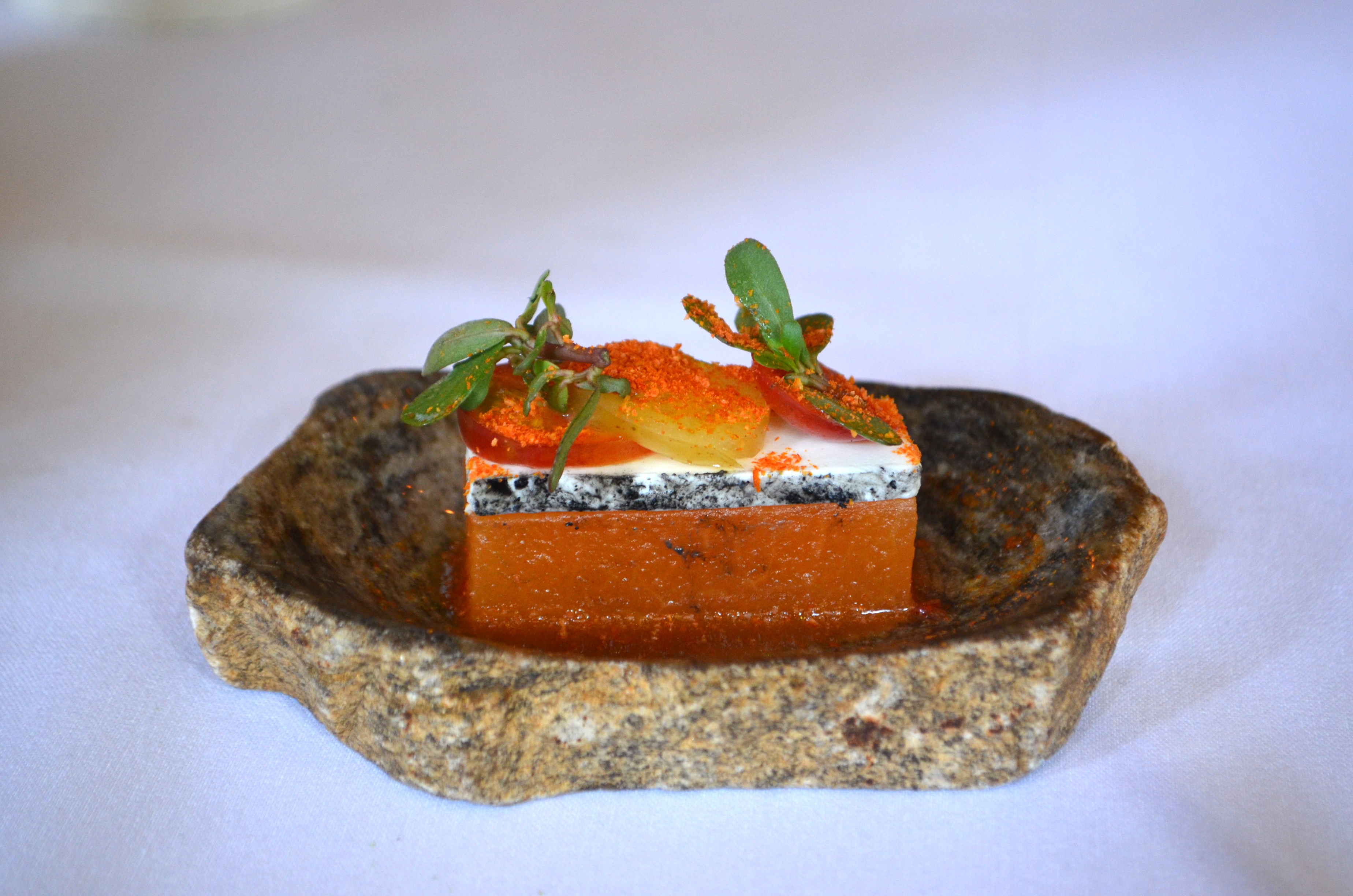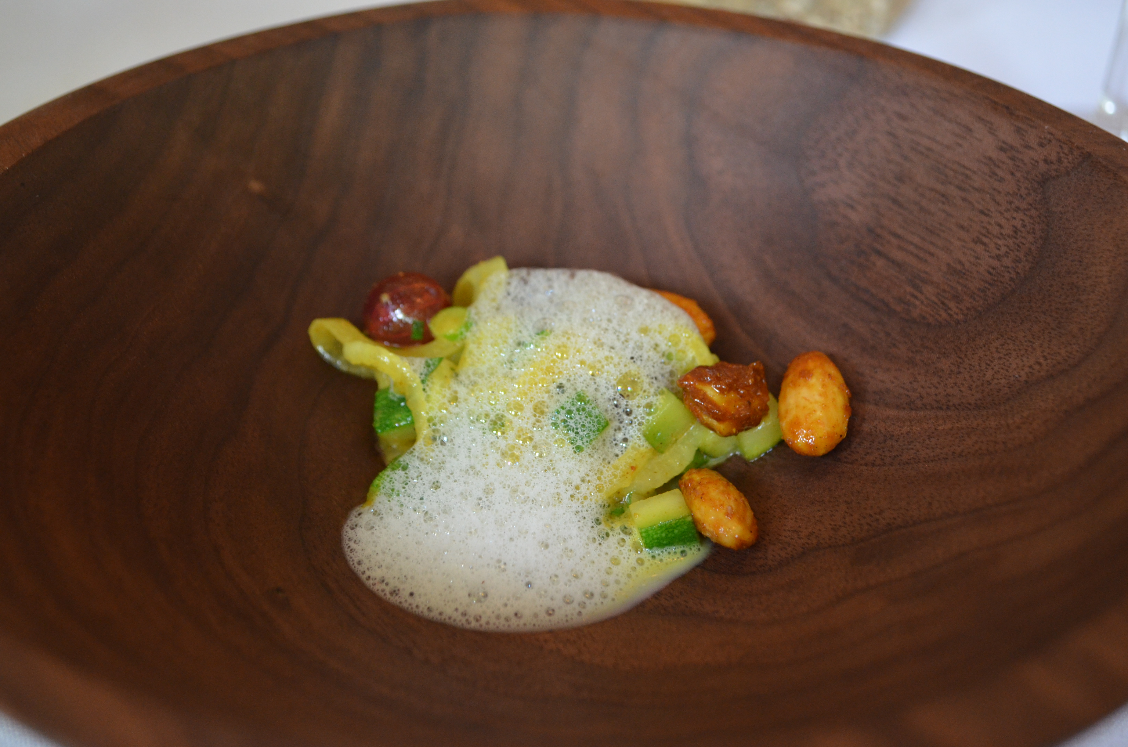 Côté table, un menu dégustation en 10 plats : beaucoup de légumes et d’herbes, aux goûts très prononcés (ah que c’est bon de retrouver le vrai goût des tomates), des présentations originales, une bonne première partie du repas à manger sans couverts, uniquement avec les mains.