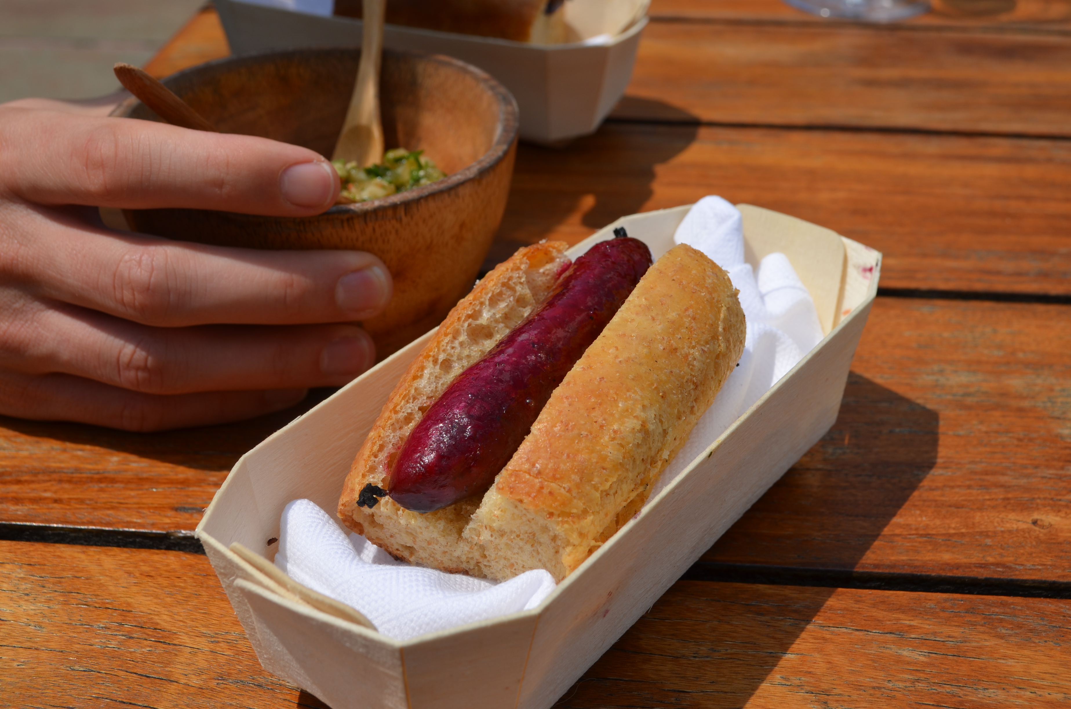Le moment où on nous a fait sortir du restaurant pour aller manger un hot-dog réalisé dehors, à la minute devant nous : à l’intérieur des saucisses de porc faites sur place dans lesquelles de la betterave a été ajoutée, d’où cette couleur violette.