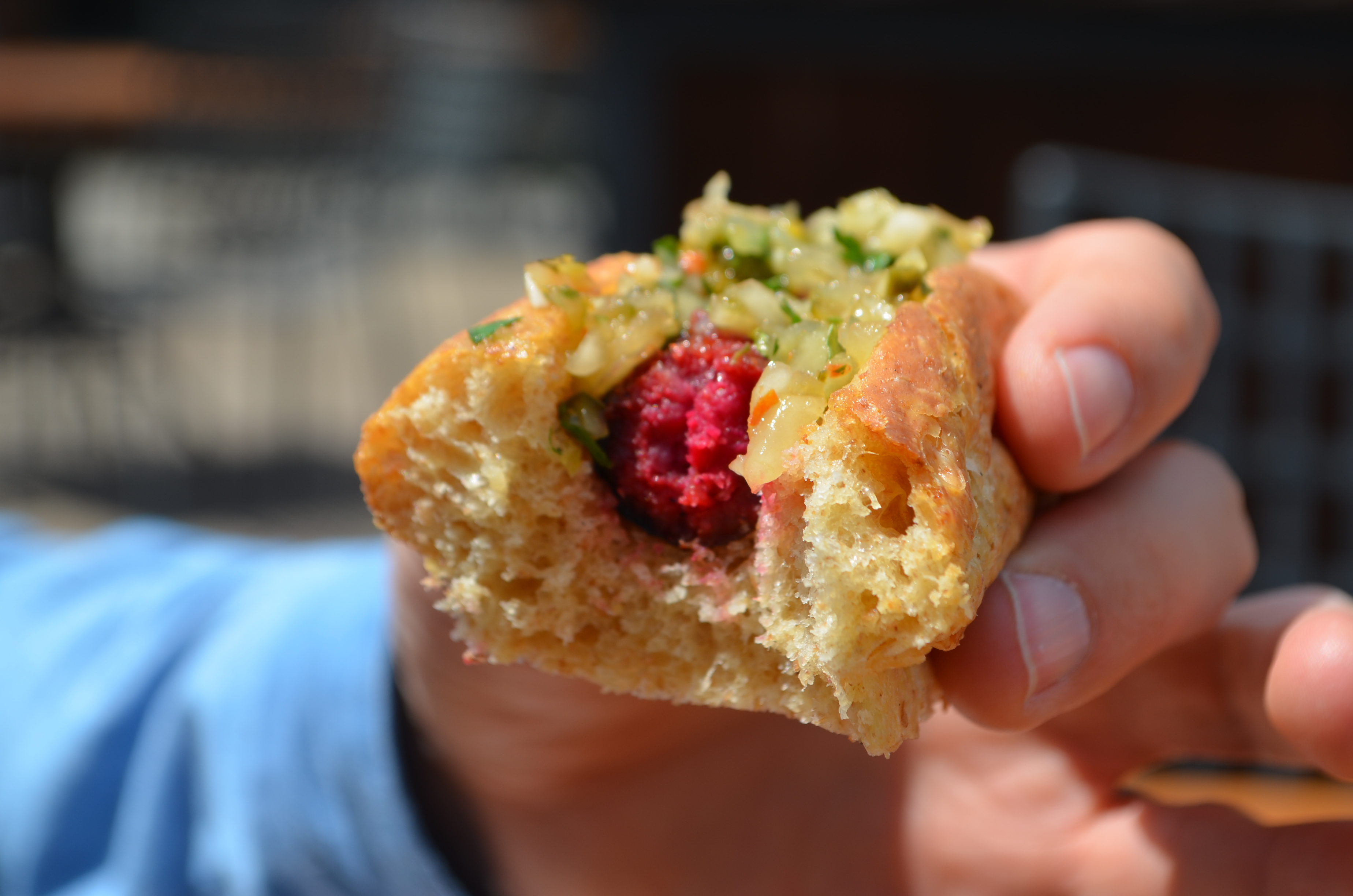 That moment when we had to go outside to eat a hot-dog cooked right in front of us: inside pork sausage made on premise in which beet was added, that’s why it has that purple color.