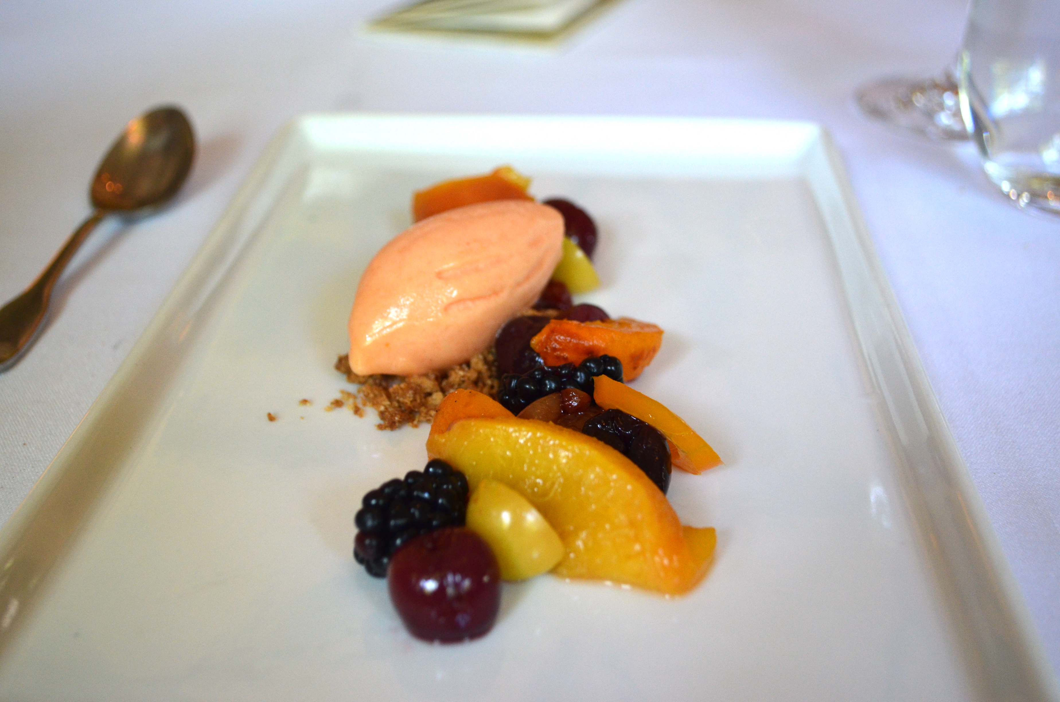 Fruits du jardin (abricots, cerises, mûres), sorbet à la pêche / Fruits from the garden (apricots, cherries, blackberries), peach sorbet